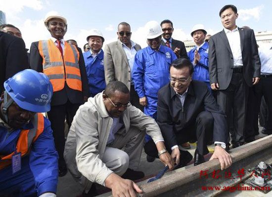 去年5月,克强总理在埃塞俄比亚访问期间,和埃塞总理海尔马里亚姆一同考察了亚的斯亚贝巴轻轨项目。考察中,克强总理和海尔马里亚姆、埃塞当地工人一起,拿起扳手,拧紧螺丝。