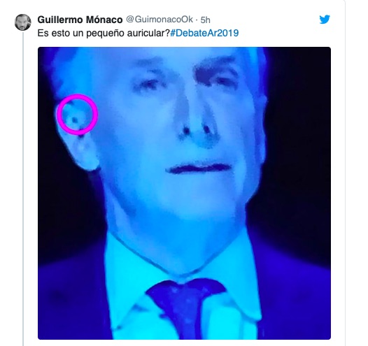 (阿根廷华人网10月21日讯 黄东)昨天晚间,第二轮总统候选人辩论吸引了众人的目光,从各候选人间的诡辩到甚至有对阴谋论的质疑。其中,马克里在辩论中的一张照片就引发了热议:马克里的耳朵里有什么东西吗?