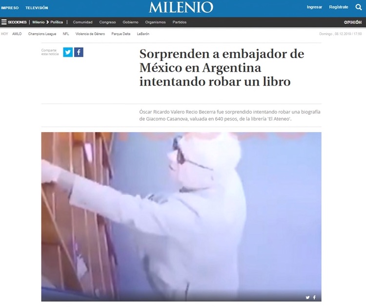 (阿根廷华人网12月9日讯 黄东)据阿根廷媒体报道,墨西哥驻阿根廷大使瓦莱罗-雷西奥-贝塞拉(Valero Recio Becerra)日前在布宜诺斯艾利斯市中心一家书店内企图盗书时被发现,并导致警方介入。鉴于其外交人员身份,警方最终放行。
