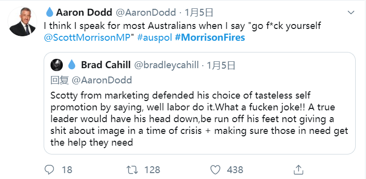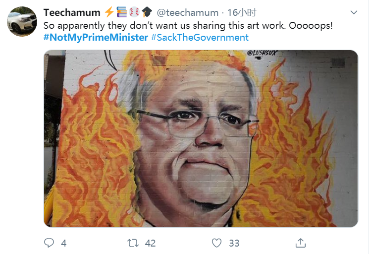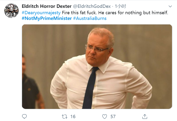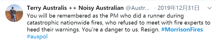 网民:“在全国灾难性火灾中,你拒绝与火灾专家会面以听取他们的建议,大家记住你了。你对我们来说危险。辞职吧。”