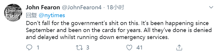 网民John说:“别相信政府的鬼话。这种情况从去年9月就发生了,而且好几年都这样。他们所做的一切就是拒绝和推延应急服务。”