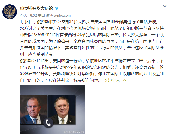 俄罗斯驻华大使馆10日通过微博官方账号发文称,“1月3日,俄罗斯联邦外交部长拉夫罗夫与美国国务卿蓬佩奥进行了电话会谈。双方讨论了美国军方在对巴格达机场实施打击时,暗杀了伊朗伊斯兰革命卫队特种部队‘圣城旅’的指挥官卡西姆·苏莱曼尼后的国际局势。拉夫罗夫强调,一个联合国的成员国,为了除掉另一个联合国成员国的官员,而且是在第三国境内且在并未告知该国的情况下,实施有针对性的军事行动的做法,严重违反了国际法准则,应当受到谴责。”