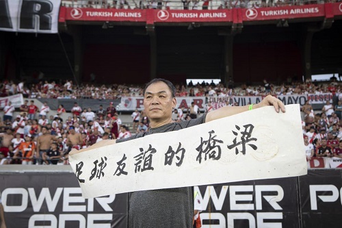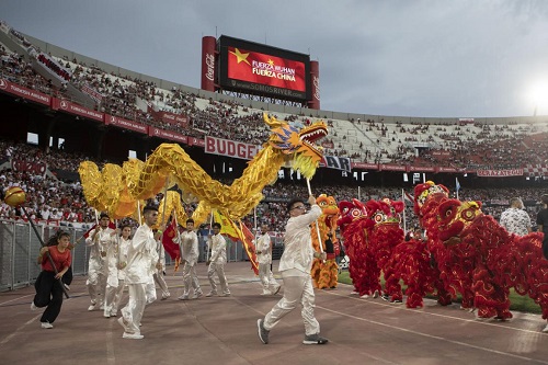 当晚,河床俱乐部主场“纪念碑”球场迎来了2019/2020赛季阿根廷足球超级联赛第20轮河床队主场对阵班菲尔德俱乐部的比赛。赛前,由阿根廷本地人组成的舞龙舞狮团队在球迷入场通道及球场内进行了精彩表演,球迷们十分激动,纷纷靠前拍照留念,希望给家人和球队带来好运;球场大屏幕播放了2020年初在布市举办的“中国春节文化之旅”活动的集锦视频;华人书法家还在赛场上挥毫泼墨,书写“足球,友谊的桥梁”横幅。主场队员上场后,其特殊的着装更是吸引了现场和电视机前观众的注意:特制的球衣上,每位场上队员的姓名均用中文书就。