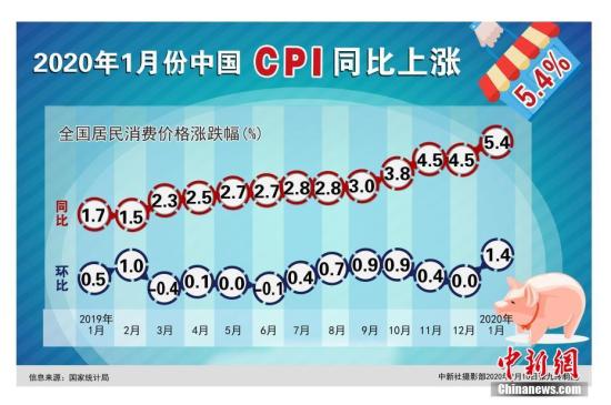 2月10日,中国国家统计局发布了2020年1月份全国CPI(居民消费价格指数)数据。2020年1月份,全国居民消费价格同比上涨5.4%。中新社记者 张九玲 制图