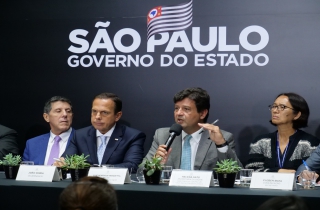 △巴西卫生部长路易斯·曼德塔和圣保州州长若昂·多利亚介绍巴西防疫措施