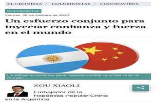 2020年2月28日,驻阿根廷大使邹肖力在阿主流媒体《纪事报》发表题为《携手为世界注入信心和力量》的署名文章。
