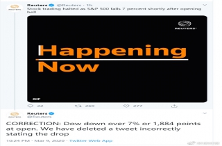 根据英国路透社的报道,美国股市就在3月9日开市后,其多个股指便立刻出现了7%的暴跌。