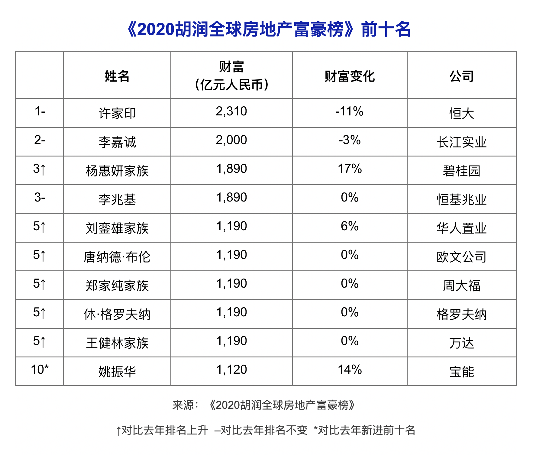《2020胡润全球房地产富豪榜》的上榜企业家主要财富来源于房地产领域,上榜门槛为十亿美元,财富计算截止日期为2020年1月31日。据此标准,胡润研究院在全球共找到256位十亿美元地产企业家,比去年增加17位。总财富达6.7万亿元人民币,比去年增长11%。