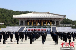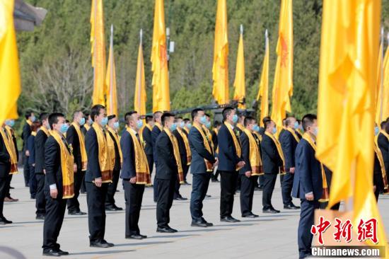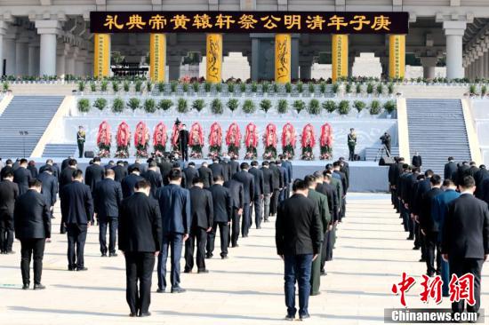 参祭人员向轩辕黄帝像鞠躬。