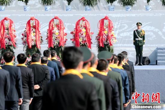 典礼开始前,参祭人员集体默哀,表达对抗击新冠肺炎疫情斗争牺牲烈士和逝世同胞的深切哀悼。(中新社记者 张远 摄)