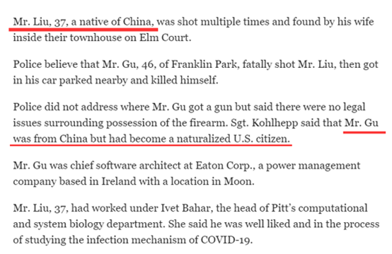 近日,美国匹茨堡大学一名研究新冠病毒的中国研究人员遭枪杀的事情,引起中美媒体的广泛关注和报道。
