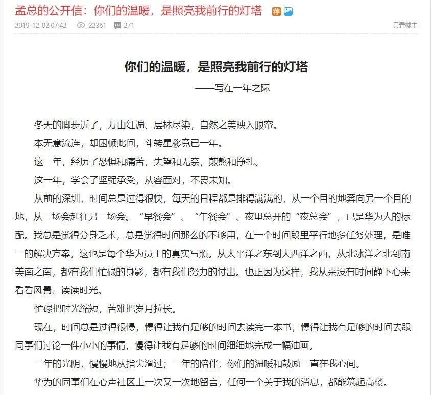 12月2日,在被加拿大拘押一周年之际,孟晚舟发布一封公开信,称忙碌把时光缩短,苦难把岁月拉长。自己学会了坚强承受、从容面对,感谢大家对她的温暖和鼓励。
