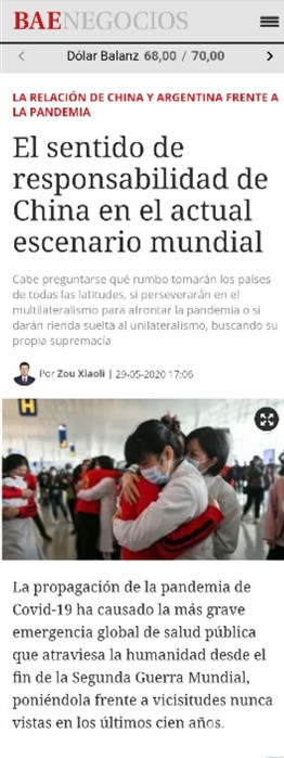 2020年5月29日,驻阿根廷大使邹肖力在阿主流媒体《布宜诺斯艾利斯经济导报》发表题为《百年变局中彰显中国担当》的署名文章。