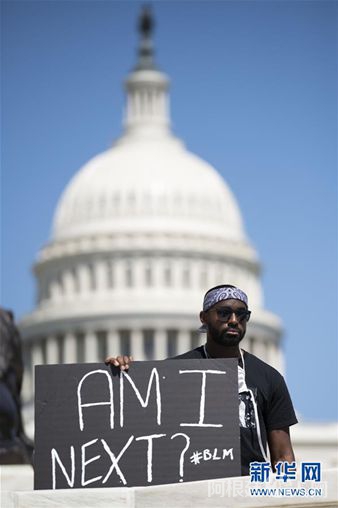 5月30日,在美国首都华盛顿国会山附近,一名男子手持标语参加抗议活动。 新华社记者 刘杰 摄