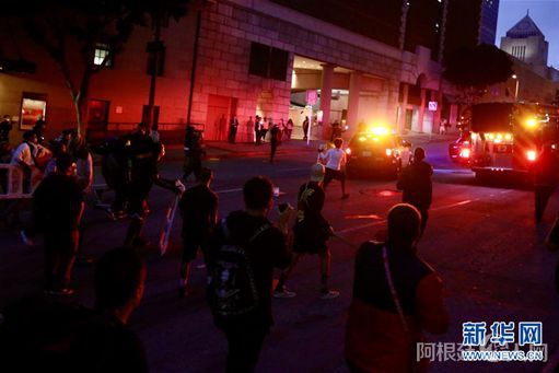 5月29日晚,在美国洛杉矶,抗议者在街头游行示威。新华社发