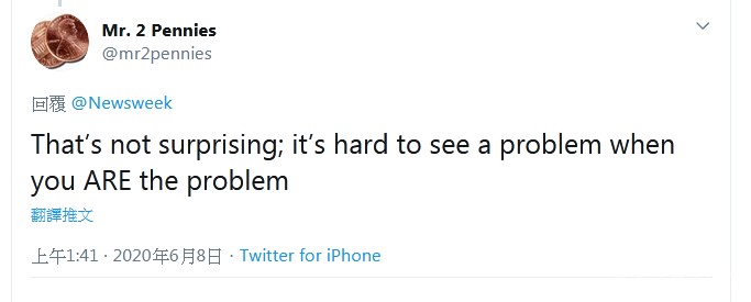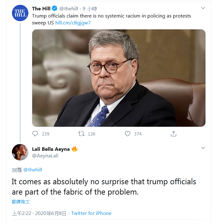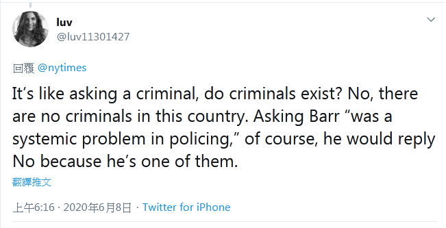 就巴尔的表态,网友luv讽刺说,“这就像是问一名罪犯,‘罪犯存在吗?’(答案是)不,这个国家没有罪犯。而问巴尔‘(种族主义)是否是警务部门中的一个系统性问题’,他的回答当然是‘不’,因为他就是其中之一。”↓