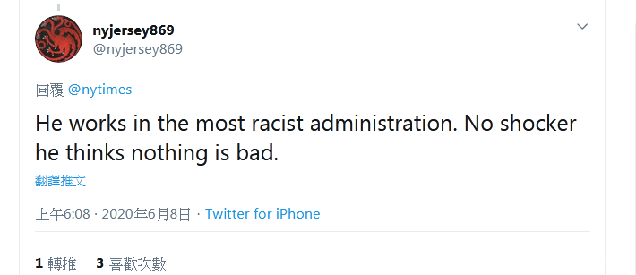 还有网友评论,“他在种族主义最严重的政府工作。他认为没什么是糟糕的。”↓