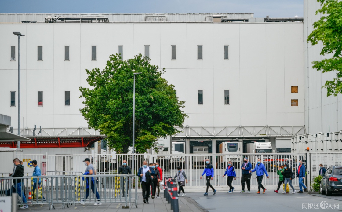 6月17日,在德国居特斯洛县,一些员工从涉事肉联厂总部外走过。
