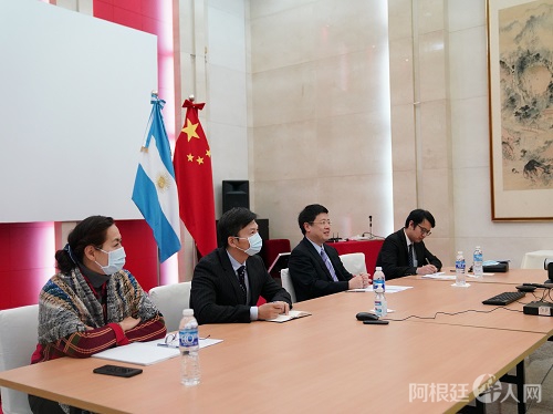 使馆王晓林政务参赞、夏娣娅商务参赞,圣菲省生产部长科斯塔马格纳、拉菲拉国立大学校长阿斯夸等参加视频会见。