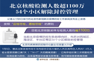 新华社北京7月6日电(记者关桂峰、田晨旭)记者从6日举行的北京市新冠肺炎疫情防控工作新闻发布会上获悉,按照“应检尽检,愿检尽检”的原则,目前北京核酸采样与检测人数均超1100万。当前北京疫情防控形势趋稳向好,先后对西城区、海淀区、丰台区等区54个小区解除封控管理。