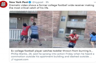 中新网7月9日电 据台湾“联合新闻网”报道,日前,美国亚利桑纳州凤凰城一栋公寓发生火灾,一名住在三楼的母亲为了让孩子有机会逃生,冒险将儿子从阳台抛下,幸有一名前大学橄榄球队员冲向前方,将小男孩稳稳接住,救了小男孩一命。