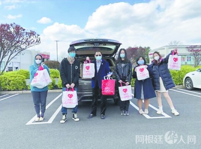 美国当地时间4月16日,美国大纽约地区福建学生学者联谊会主席刘伟(左三)为中国留美学生送上祖国寄来的“健康包”。受访者供图 |