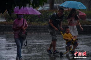 受“森拉克”影响,海南暴雨倾盆而下,民众在雨中奔跑。 骆云飞 摄