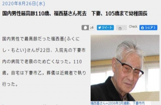 日本最长寿男性福西基于8月22日去世,享年110岁。图片来源:日本《茨城新闻》报道截图