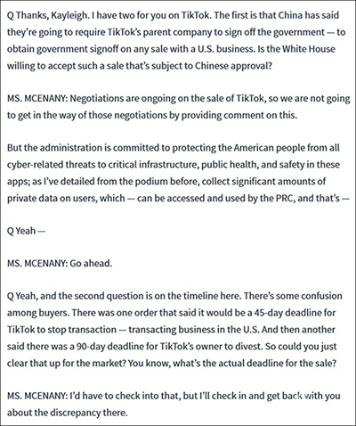 麦克纳尼没有表明美国政府对此事的具体态度。她声称,出售TikTok业务的谈判目前仍在进行中,为避免影响谈判,白宫方面不会就此类问题发表任何评论。