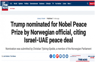 【环球网报道】据福克斯刚刚消息,特朗普被挪威议会议员提名2021年诺贝尔和平奖。理由是参与斡旋以色列与阿联酋关系正常化。