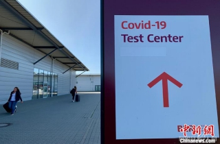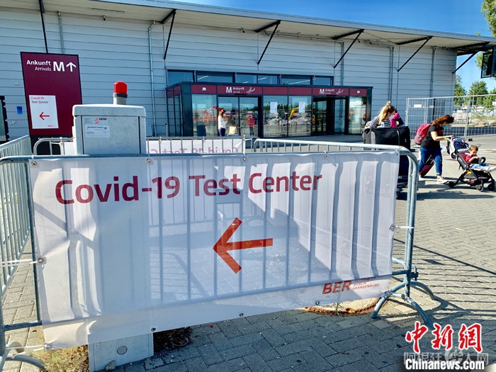 图为人们当天经过位于德国勃兰登堡州境内的柏林-舍内费尔德机场外的新冠检测中心指示牌。 中新社记者 彭大伟 摄