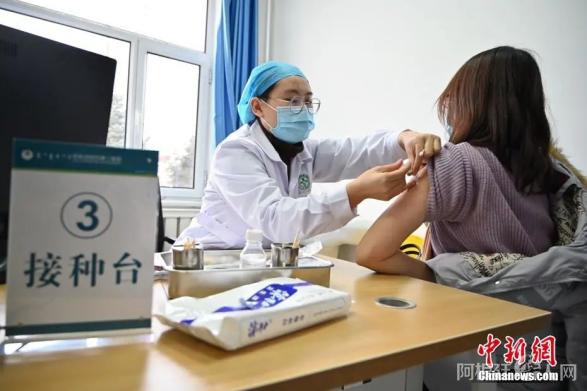 工作人员给一位女士接种新冠疫苗。图片来源:中新网