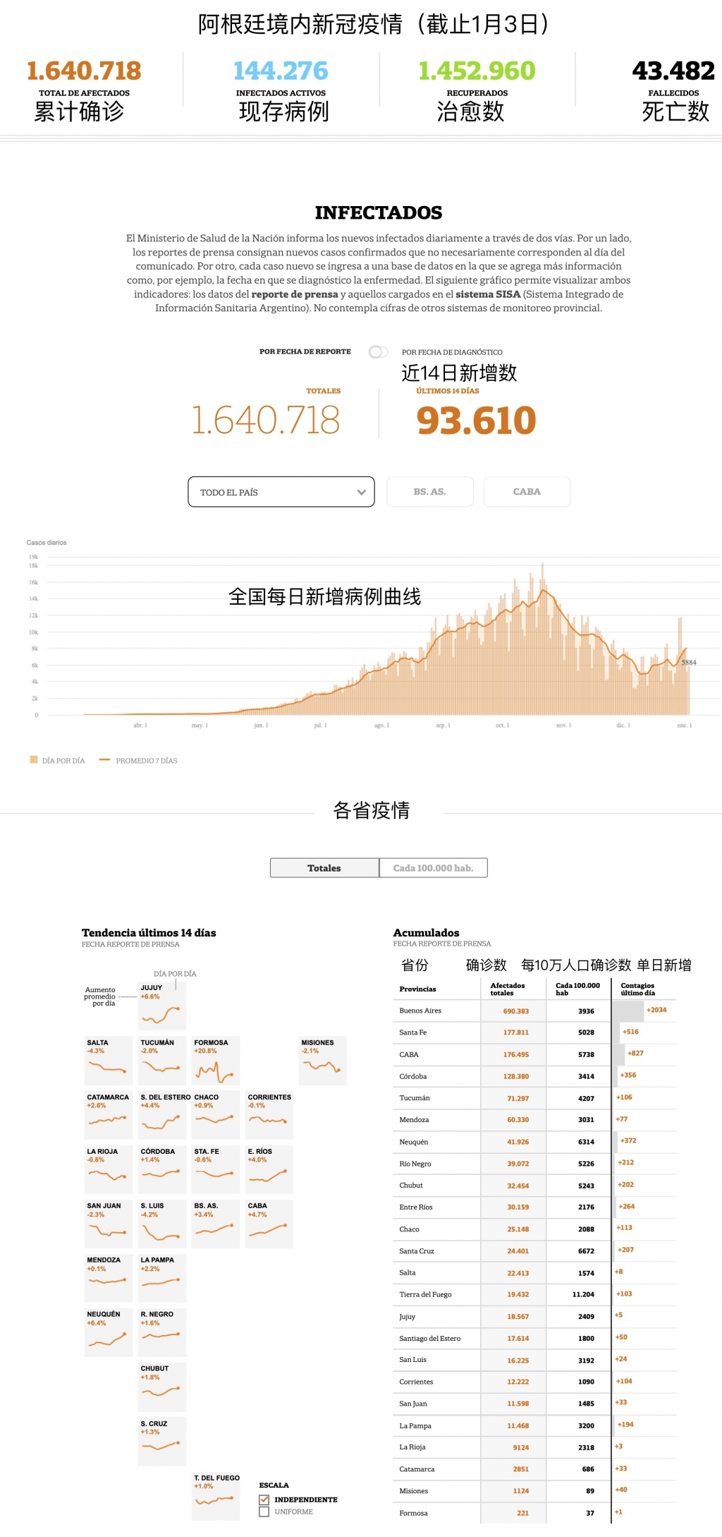 (阿根廷华人网1月11日讯/黄东)截止1月10日,阿根廷境内共确诊1722217例新冠肺炎病例,其中治愈1511750例,死亡44495例,现存165972例。