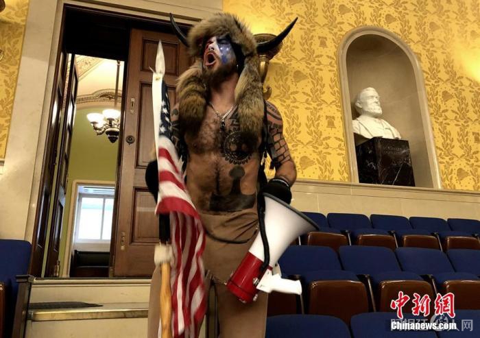 图为1月6日,示威者杰克·昂格利闯入参议院。 中新社记者 陈孟统 摄