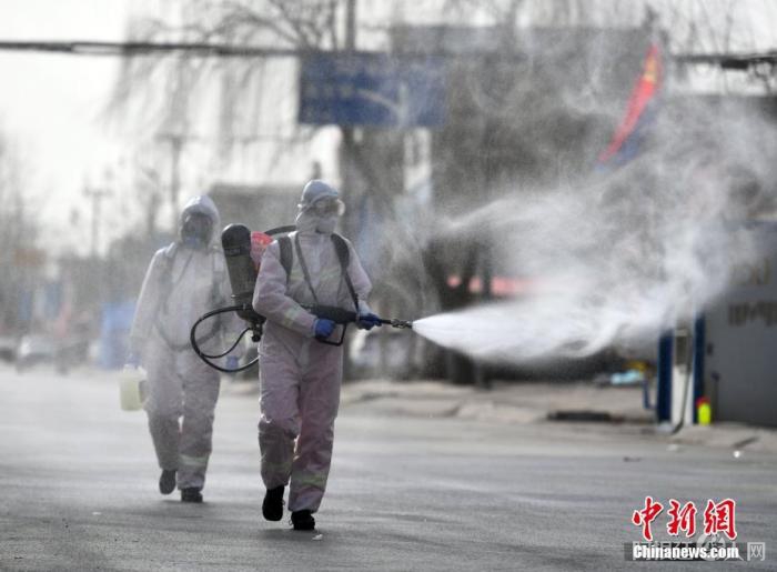 1月15日,石家庄消防救援支队藁城大队消防员在小果庄村村口路段消杀。当日,河北省石家庄市藁城区开展防疫消杀工作。 中新社记者 翟羽佳 摄
