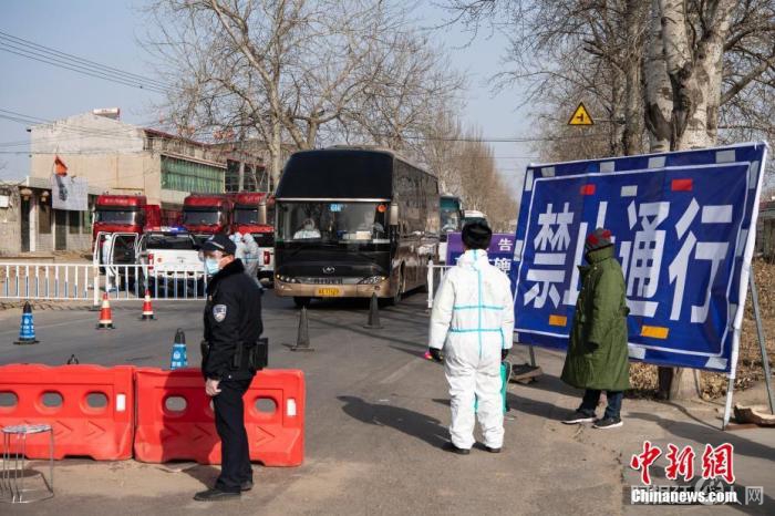 图为距离增村镇约4公里、距离小果庄村约8公里的一处疫情防控检查点,运送异地集中隔离观察人员的车辆通过此地。 中新社记者 侯宇 摄