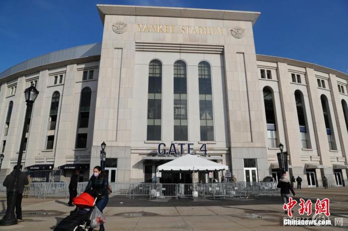 当地时间2月5日,市民走过纽约洋基球场大门。当日,纽约洋基球场作为新冠疫苗大规模接种点启用。据悉,洋基球场接种点只面向纽约布朗克斯区居民开放,计划每周接种15000人。中新社记者 廖攀 摄