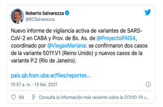 罗伯托·萨尔瓦雷扎通过其推特表示:“在关于布省及布市境内新冠病毒变种的最新监测报告中,已证实发现两例501Y.V1(英国)变种及多例P.2(里约热内卢)变种。”
