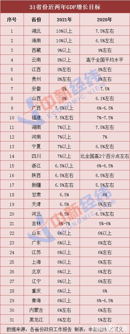 从31省份公布的2021年GDP增长目标来看,多个省份较去年上调。