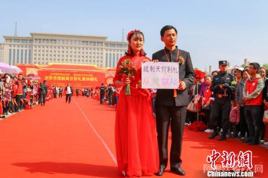 资料图: 2018年5月4日,甘肃庆阳市举办了“移风易俗青年先行”集体婚礼,54对新人参加婚礼并承诺“抵制天价彩礼,从我做起”。 陈飞 摄