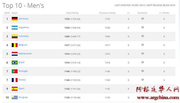 世界前十球队的排名与11月相比没有发生变化:依次为德国、阿根廷、哥伦比亚、比利时、荷兰、巴西、葡萄牙与法国并列第7、西班牙、乌拉圭。