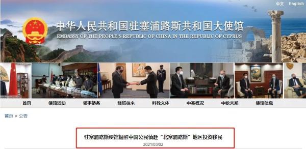 中国驻塞浦路斯大使馆强调,近年来,国内一些开发商和中介公司大肆宣传赴“北塞”地区投资移民项目,甚至称“北塞浦路斯土耳其共和国”是欧洲国家,在“北塞”投资有望获得塞浦路斯共和国的永久居留权以及欧盟相关待遇。