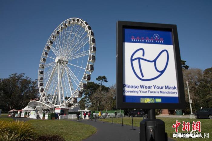 当地时间3月12日,美国加利福尼亚州旧金山金门公园的摩天轮排队处竖立着提醒人们佩戴口罩的标识。中新社记者 刘关关 摄