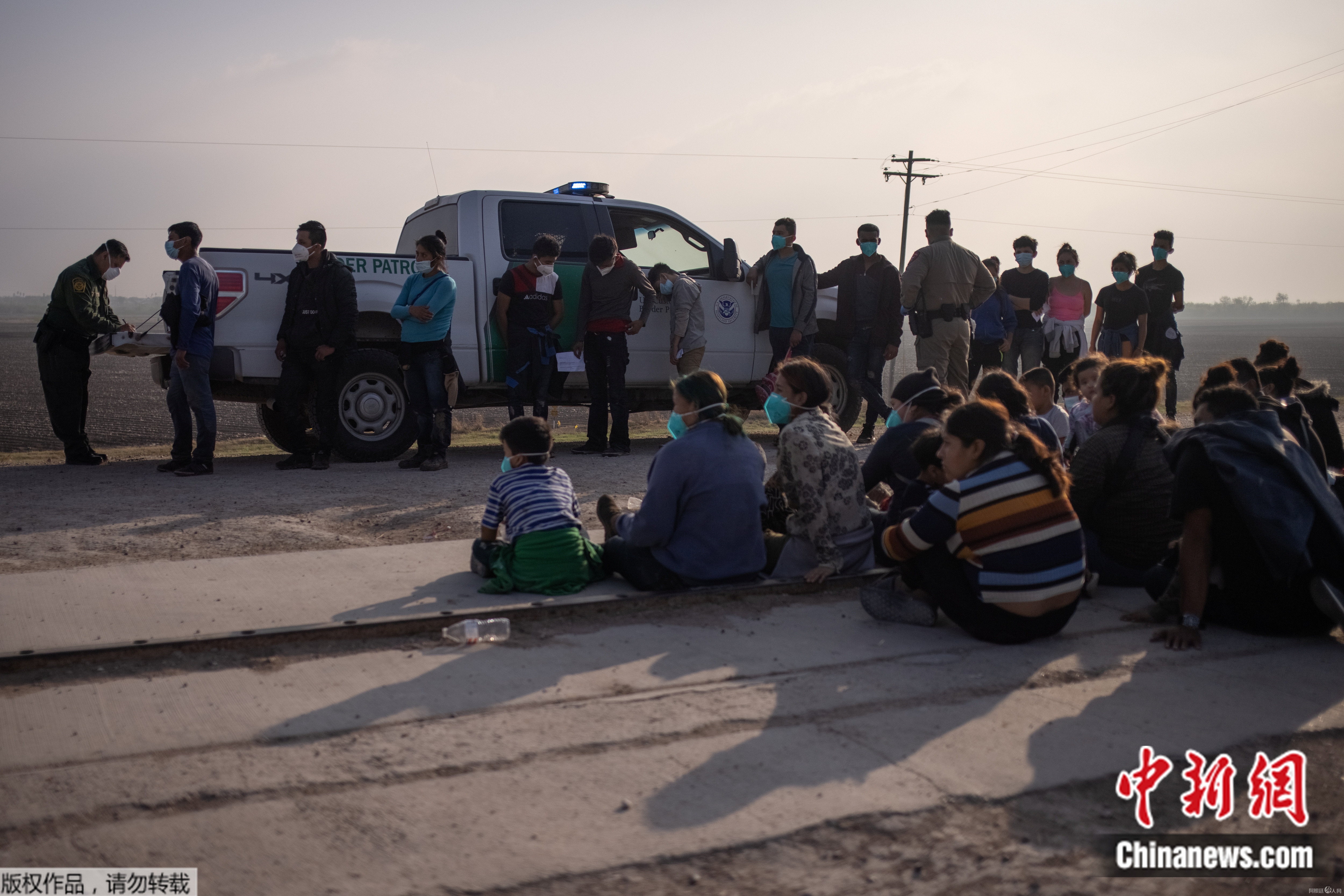 当地时间3月17日,美国得克萨斯州,边境执法人员与前来寻求庇护的非法移民家庭。