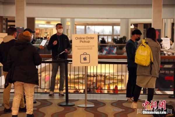 当地时间4月3日,加拿大多伦多一商场内,预约取货的顾客在一电子通讯产品店外排队。中新社记者 余瑞冬 摄