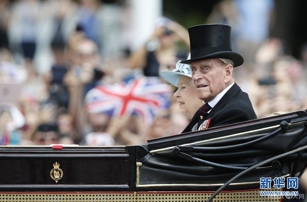这张2017年6月17日拍摄的资料照片显示,在英国伦敦,英国女王伊丽莎白二世和丈夫菲利普亲王乘坐马车离开白金汉宫,准备观看阅兵式,庆祝女王91岁官方生日。新华社记者韩岩摄