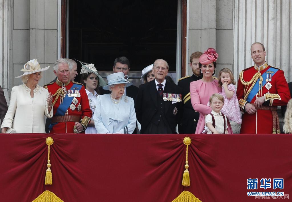 这张2017年6月17日拍摄的资料照片显示,英国女王伊丽莎白二世(前左三)与丈夫菲利普亲王(前左四)及其他英国王室成员在伦敦白金汉宫的阳台上准备观看飞行表演。新华社记者韩岩摄