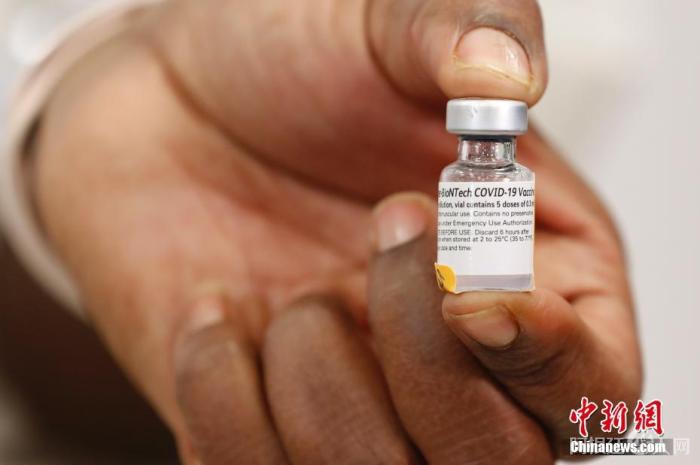 2020年12月,纽约长岛犹太医疗中心护士展示美国首批新冠疫苗。当日,辉瑞公司首批近300万剂新冠疫苗陆续运抵美国各地。 中新社记者 廖攀 摄