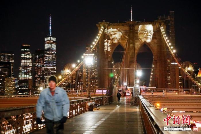 当地时间3月14日晚,美国纽约市政府将因新冠肺炎去世的患者面容投影在布鲁克林大桥桥身上,表达对逝者的怀念。 中新社记者 廖攀 摄