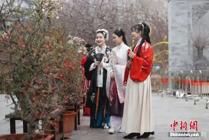 资料图:身着汉服的女孩在公园赏花。中新社记者 杜洋 摄
